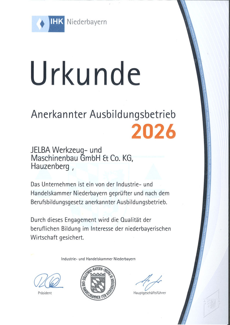Die JELBA Werkzeug- und Maschinenbau GmbH & Co. KG wurde von der IHK Niederbayern offiziell als anerkannter Ausbildungsbetrieb bestätigt. Diese Auszeichnung unterstreicht unseren hohen Anspruch an eine qualitativ hochwertige und praxisnahe Berufsausbildung. Für JELBA ist